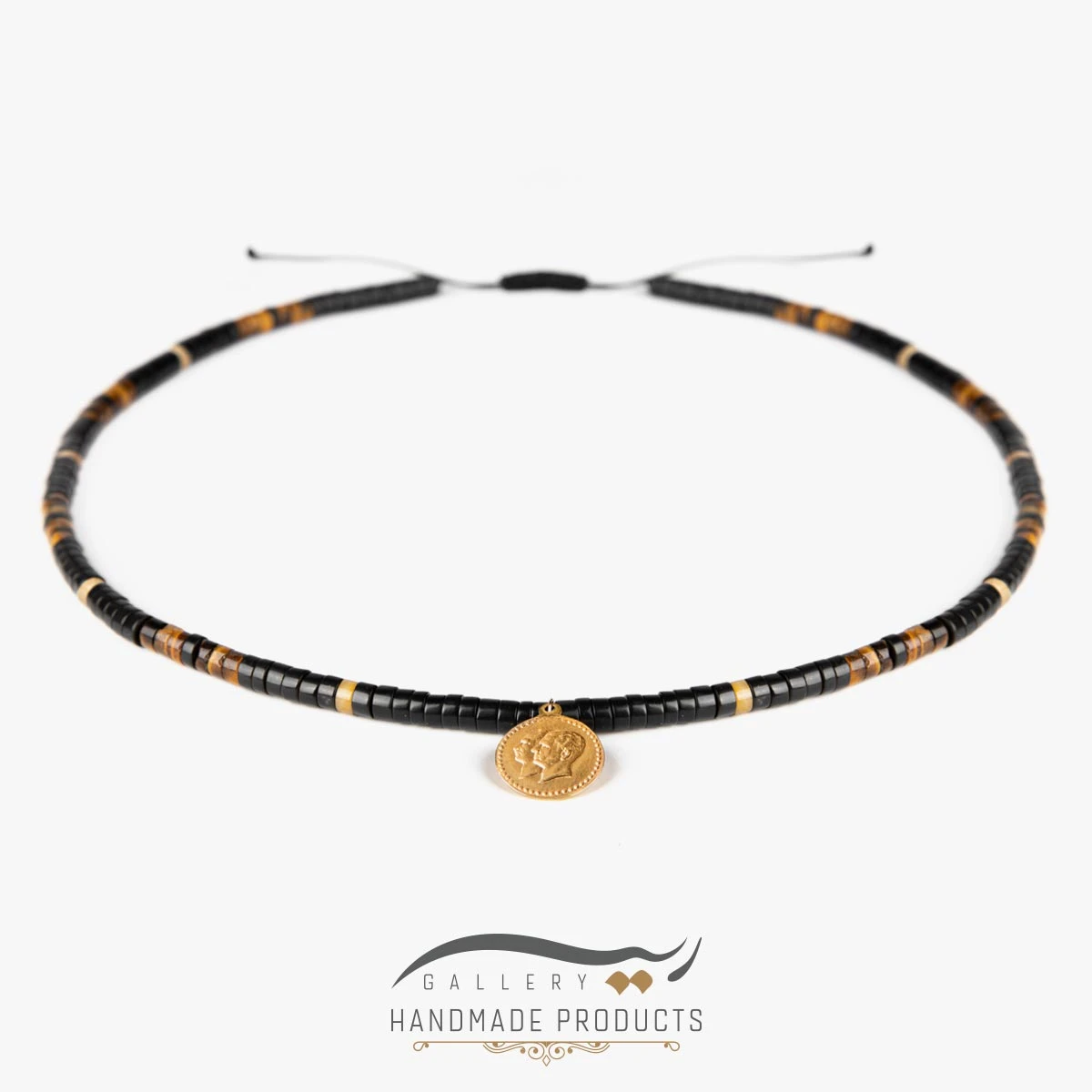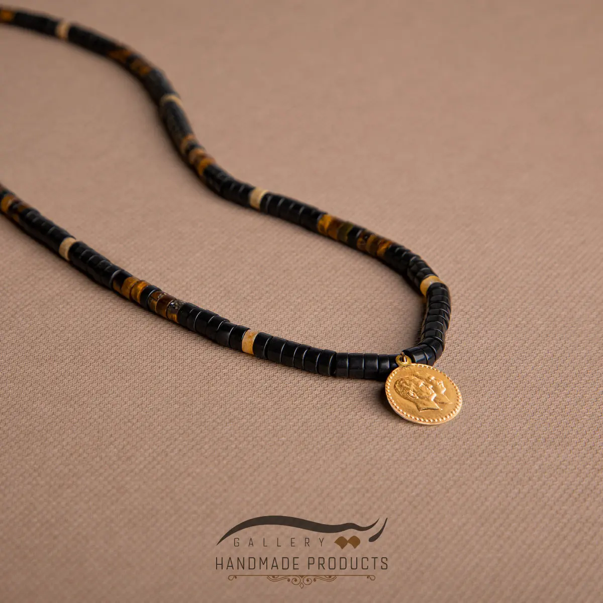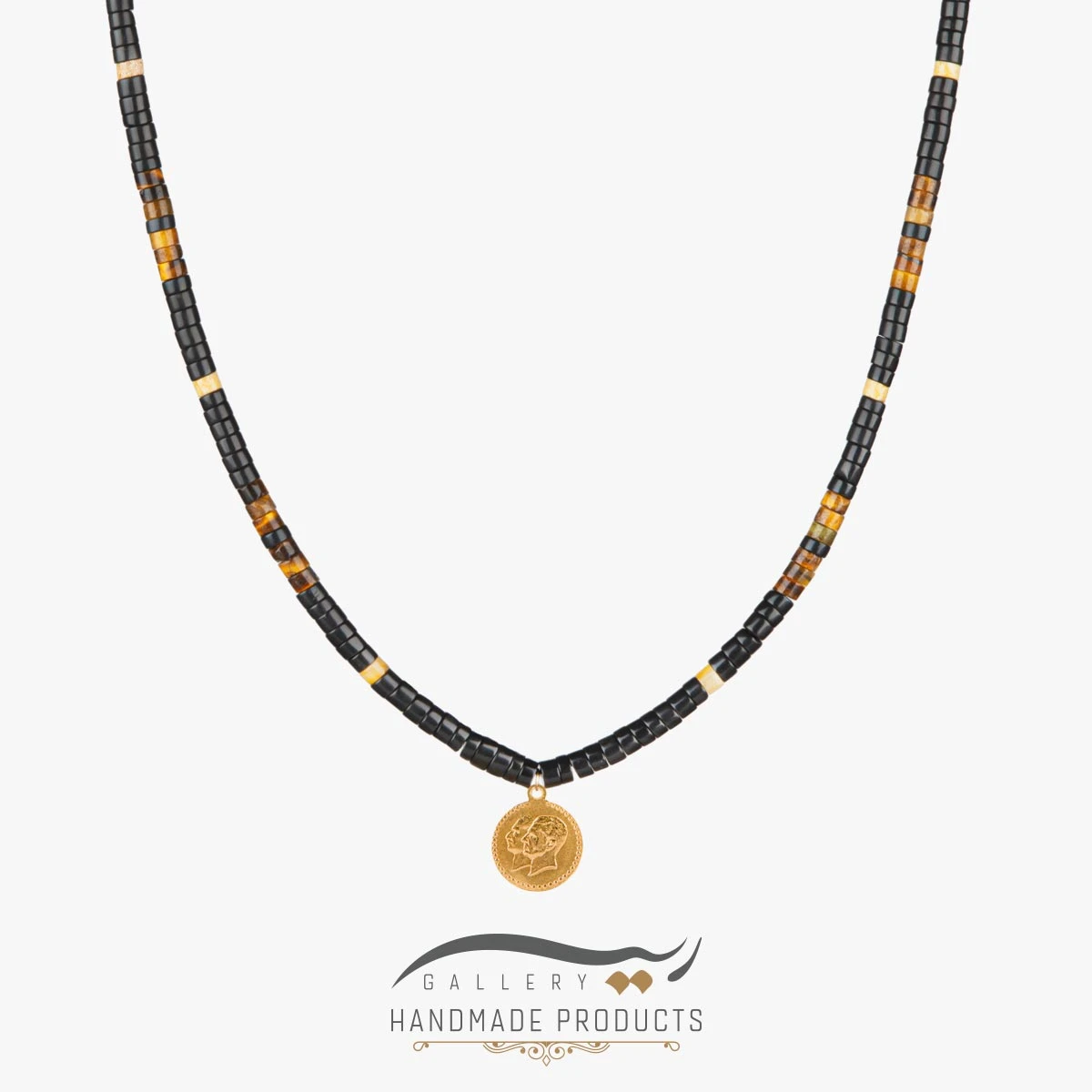 ریسه گالری در طراحی گردنبند طلا مردانه دو رخ، علاوه بر استفاده از طلا، از جاسپر خزهای، سنگ چشم ببر و سنگ اونیکس نیز بهره برده تا این گردنبند را برای آقایان طراحی و تولید کند. این گردنبند، دارای پلاکی از طلا است که نقش سکه دو رخ، بر روی آن حکاکی شده و بین مهرههای واشری سنگ اونیکس قرار گرفته است. طول تقریبی زنجیر این محصول برابر با 70 سانتیمتر هست که با قفل کشویی – گرهای، به راحتی میتوان آن را باز و بسته کرده و اندازه آن را تنظیم کرد.