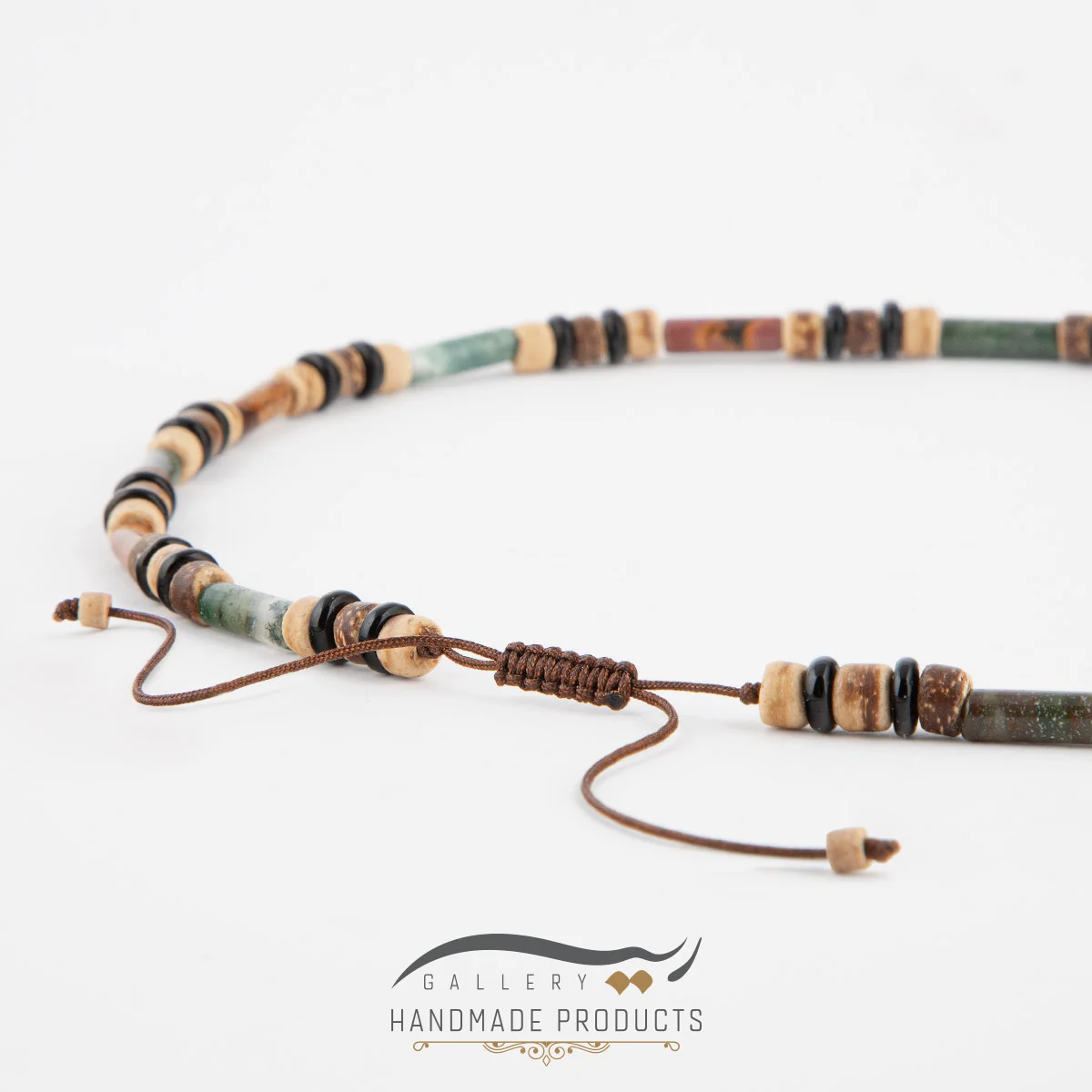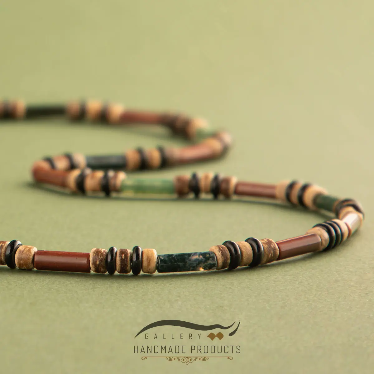 گردنبند مردانه سنگ طبیعی یشم از دسته محصولاتی میباشد که ریسه گالری از سنگ یشم و سنگ اونیکس و جاسپر موکائیت به همراه چوب صندل برای طراحی و تولید آن استفاده کرده است. این گردنبند مردانه که مناسب برای آقایان میباشد، زنجیری به طول تقریبا 60 سانتیمتر دارد و با قفل کشویی – گرهای که در انتهای آن تعبیه شده به راحتی میتوان آن را باز و بسته کرد. آقایانی که به سایر فلزات حساسیت دارند، میتوانند بدون نگرانی، در تمام طول روز از این گردنبند استفاده کنند.
