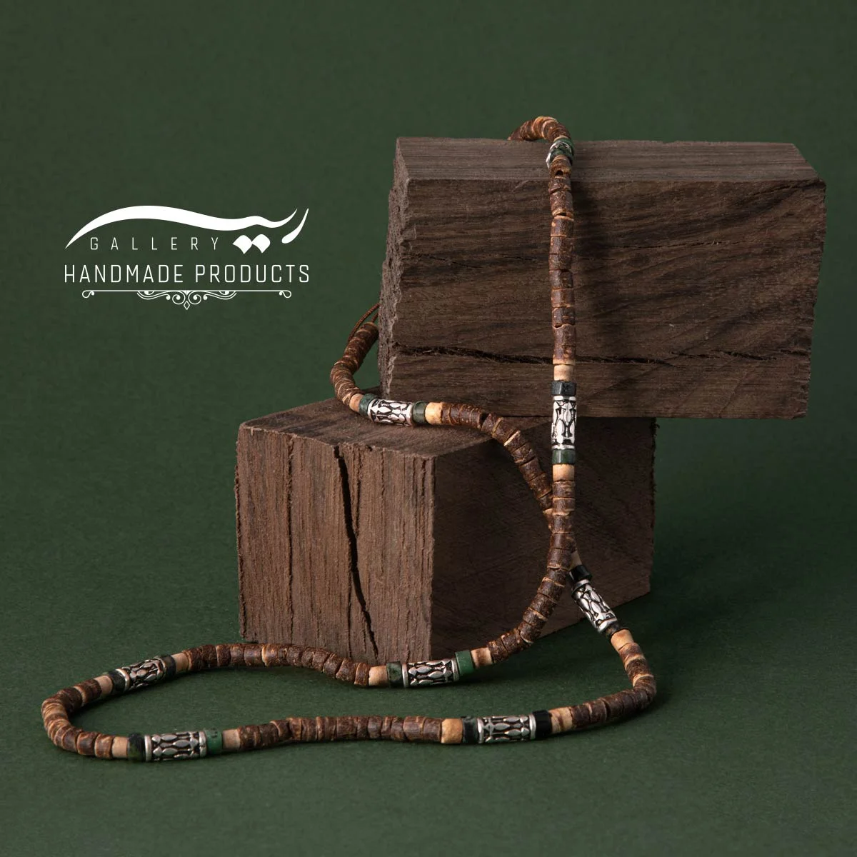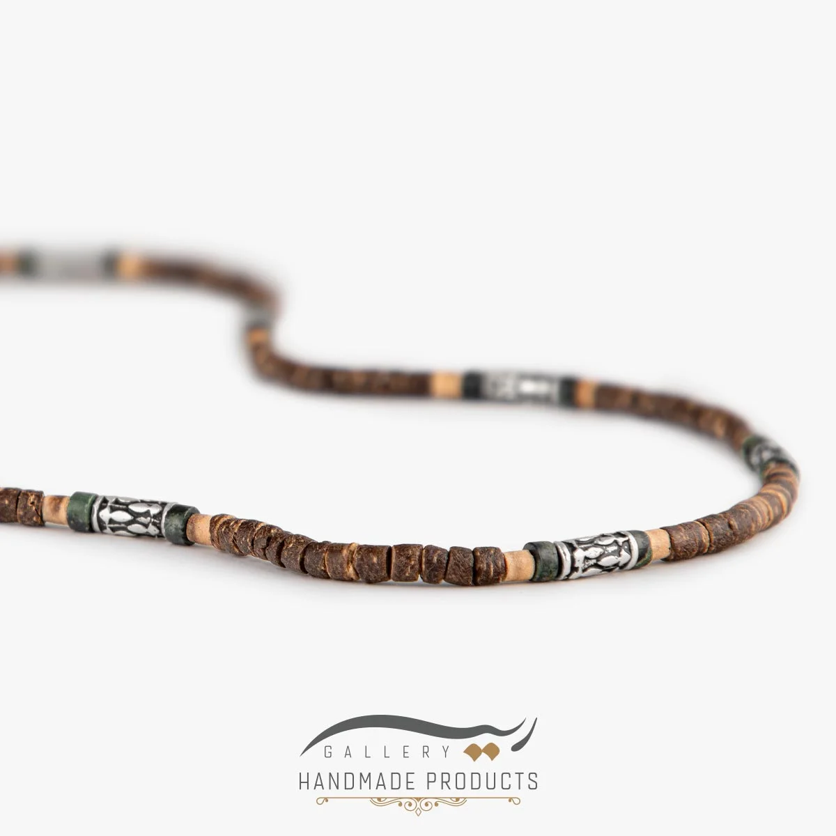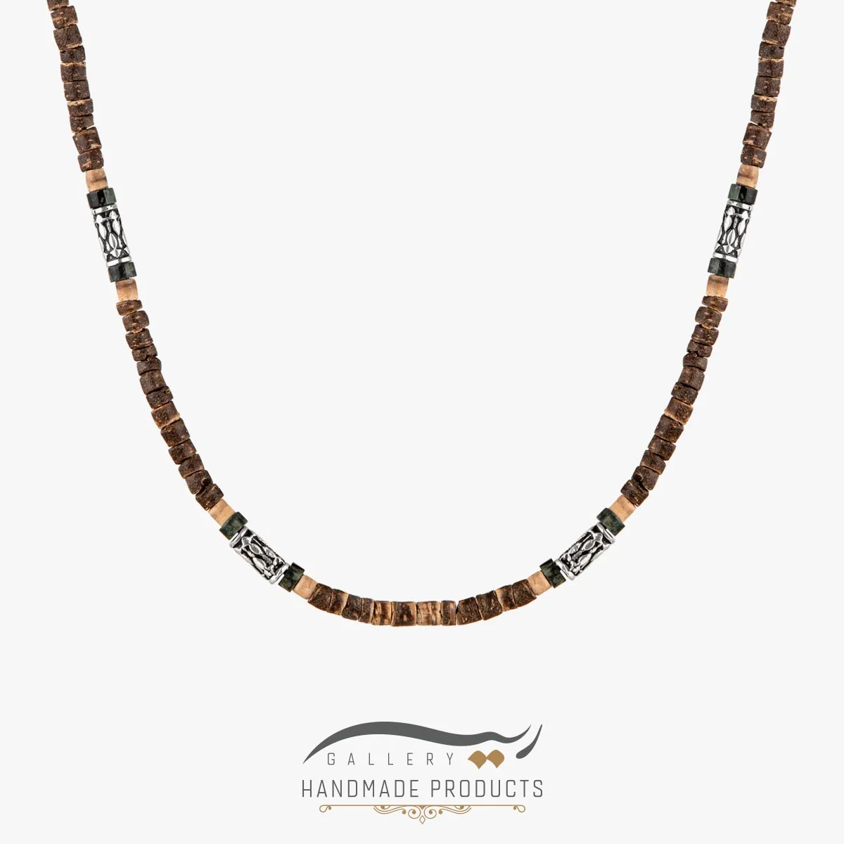 ریسه گالری گردنبند نقره مردانه چاگا را با استفاده از سنگ گارنت سبز، چوب آبنوس و نقره طراحی کرده است. این گردنبند مردانه، زنجیری به طول تقریبی 50 سانتیمتر دارد و با قفل کشویی–گرهای که برای این گردنبند تعبیه شده به راحتی می توان آن را باز و بسته کرد.