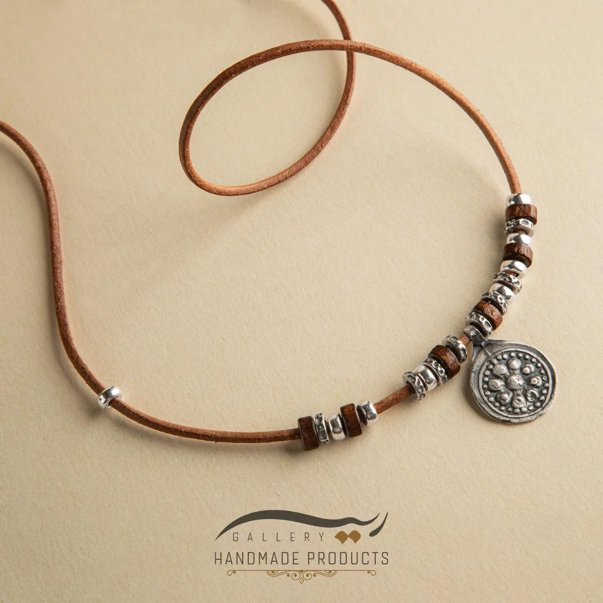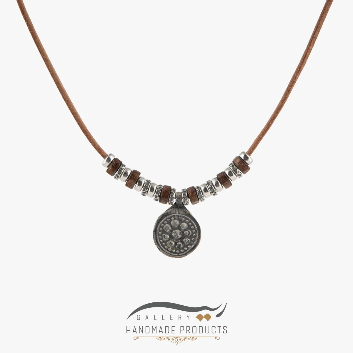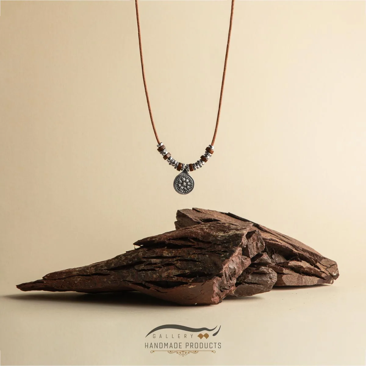 ریسه گالری برای طراحی و ساخت گردنبند نقره شمسه علاوه بر استفاده از نقره از بند چرم و چوب نیز بهره برده است. در این گردنبند از چوب و چندین واشر نقره در دو طرح ساده و چکشی استفاده شده که در مرکز آنها، یک پلاک با طرح گل هشتپر ختایی از جنس نقره از آن آویز شده تا رخ زیبایی به کار اضافه کند. طول کلی آن 50 سانتیمتر است و تا 10 سانتیمتر از هر طرف قابلیت افزایش سایز دارد. افرادی که به سایر فلزات حساسیت دارند، میتوانند بدون نگرانی، در تمام طول روز این گردنبند را به گردنشان بیاندازند.