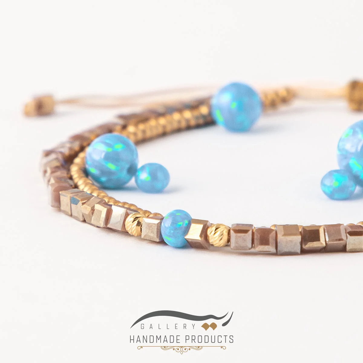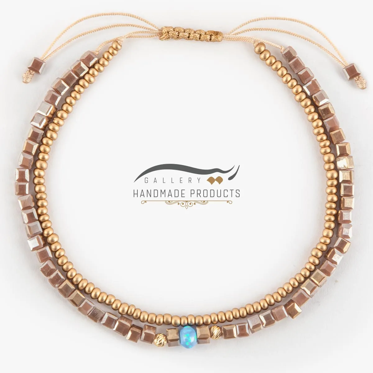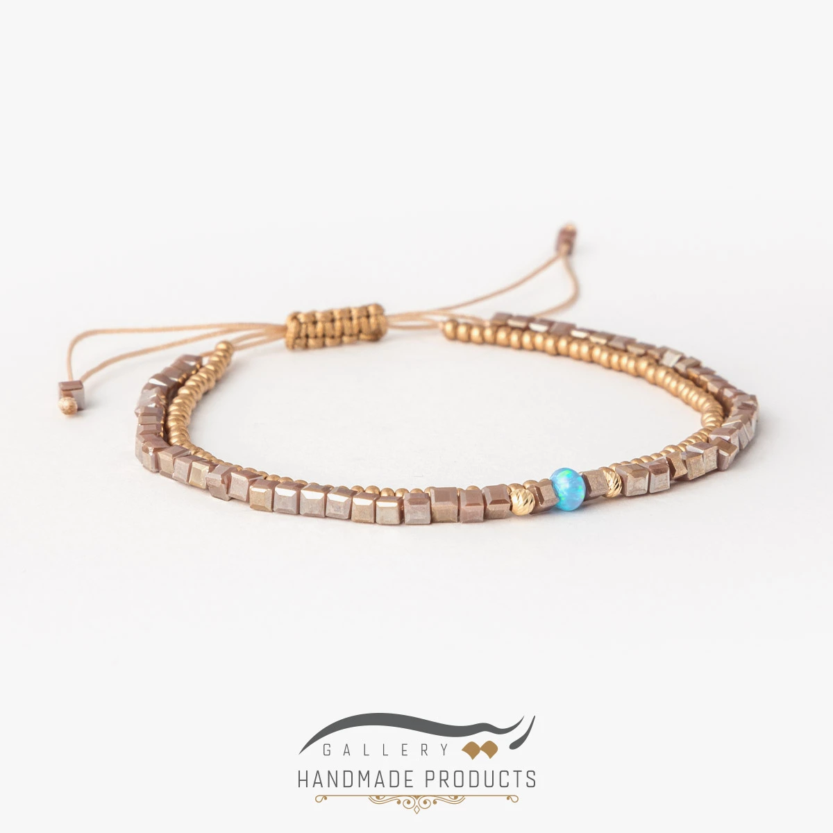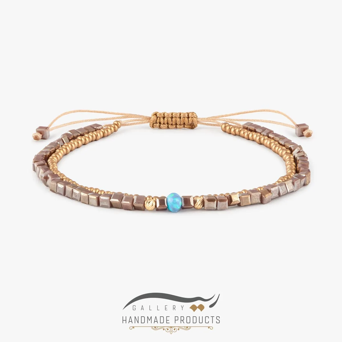 دستبند طلا زنانه موانا، دستبندی می باشد که ریسه گالری برای طراحی و ساخت آن از طلا، اوپال، کریستال برند چک و منجوق برند چک بهره برده است. این دستبند دارای یک گوی اوپال به عنوان پلاک و 2 گوی برناردو از جنس طلا میباشد که در طرفین اوپال قرار گرفته و در امتداد آن از کریستالهای برند چک و منجوق طلایی برند چک استفاده شده تا جلوهی بیشتر و ظرافت بالاتری به این محصول ببخشد. در انتهای این دستبند نیز، بافتی کشویی – گرهای وجود دارد که باز و بسته کردن آن را ساده کرده و قابلیت تنظیم سایز دلخواه را فراهم می کند. خانمهایی که به سایر فلزات حساسیت دارند، میتوانند بدون نگرانی، در تمام طول روز این دستبند را به دستشان بیاندازند.
