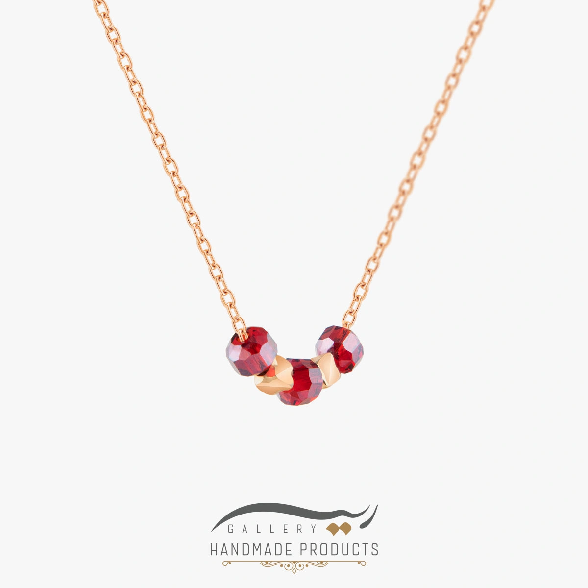 گردنبند طلا زنانه crimson با استفاده از زنجیر و قفل طلا به همراه مکعب تراشدار طلا و سه کریستال سرخ که، به عنوان پلاک استفاده میشوند، طراحی شده است. این گردنبند زنانه، زنجیری به طول 40 سانتیمتر دارد و خانمهایی که به سایر فلزات حساسیت دارند، میتوانند بدون نگرانی، در تمام طول روز این محصول را به گردن بیاندازند.