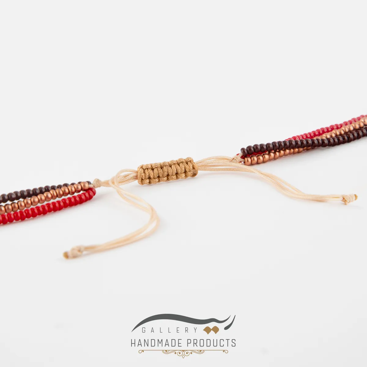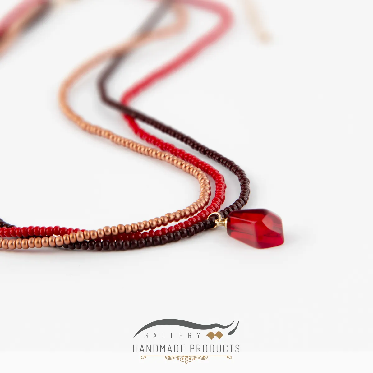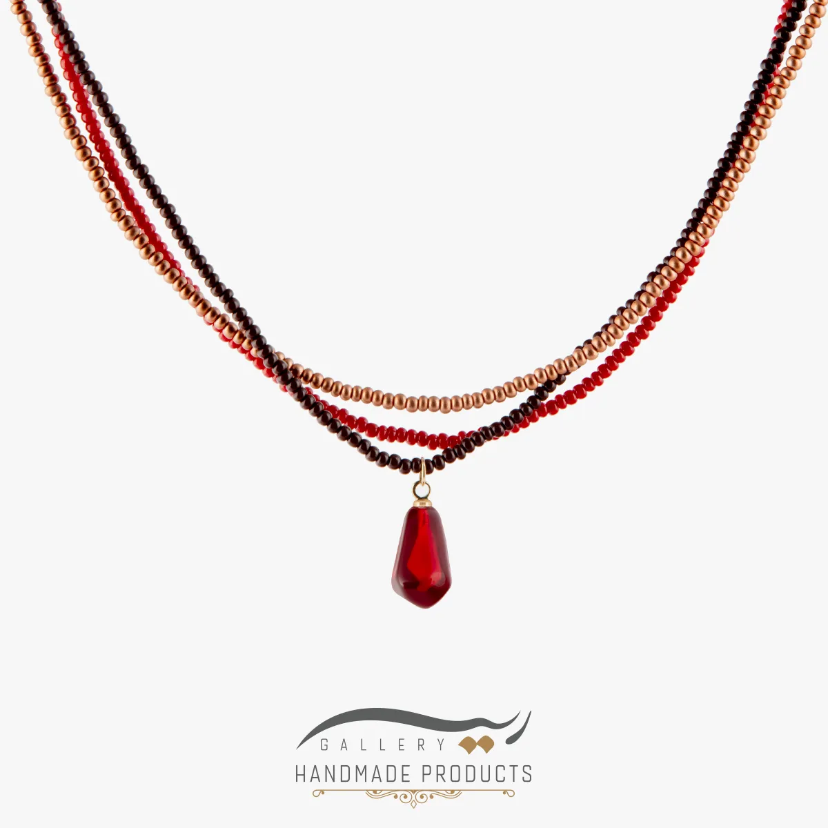 گردنبند طلا زنانه مسگون، یکی از جدیدترین محصولات گردنبند ساخته ریسه گالری است که تم رنگی جذاب و گرم و در عین حال منحصر به فرد خودش را دارد. این محصول با استفاده از سه ردیف منجوق با رنگهای جذاب طراحی شده است و در مرکز گردنبند، پلاک طلا طرح دانه انار از جنس رزین قرار داده شده است. طول کلی این گردنبند برابر با 40 سانتی متر میباشد. در انتهای این گردنبند، بافتی کشویی – گرهای وجود دارد که باز و بسته کردن آن را ساده کرده و تا 10 سانتیمتر از هر طرف، قابلیت تنظیم سایز دلخواه را فراهم می کند.