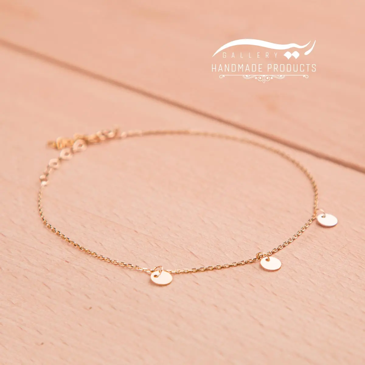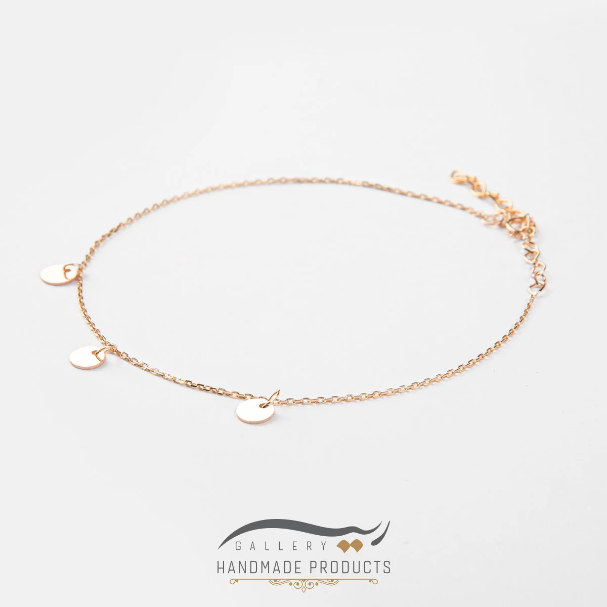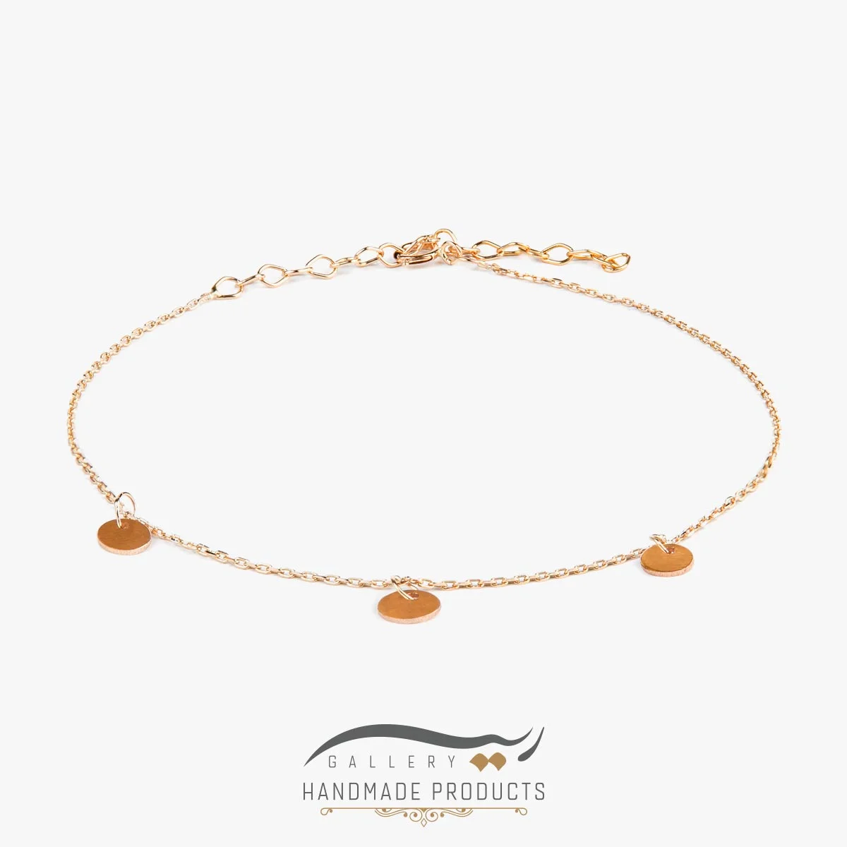 پابند طلا زنانه پولکی، پابندی مینیمال می باشد که ریسه گالری برای طراحی و تولید آن از طلا استفاده کرده است.در طراحی این پابند سه عدد پولکی دایرهای شکل به کار رفته که با فاصلهای مشخص از هم کنار یکدیگر قرار گرفتهاند. این پابند که مناسب برای خانمهاست اندازهای به طول 25 سانتی متر دارد که از این مقدار 5 سانتی متر آن مختص زنجیر سایز آن می باشد. خانمهایی که به سایر فلزات حساسیت دارند، میتوانند بدون نگرانی، در تمام طول روز این پابند را به پای خود بیاندازند.