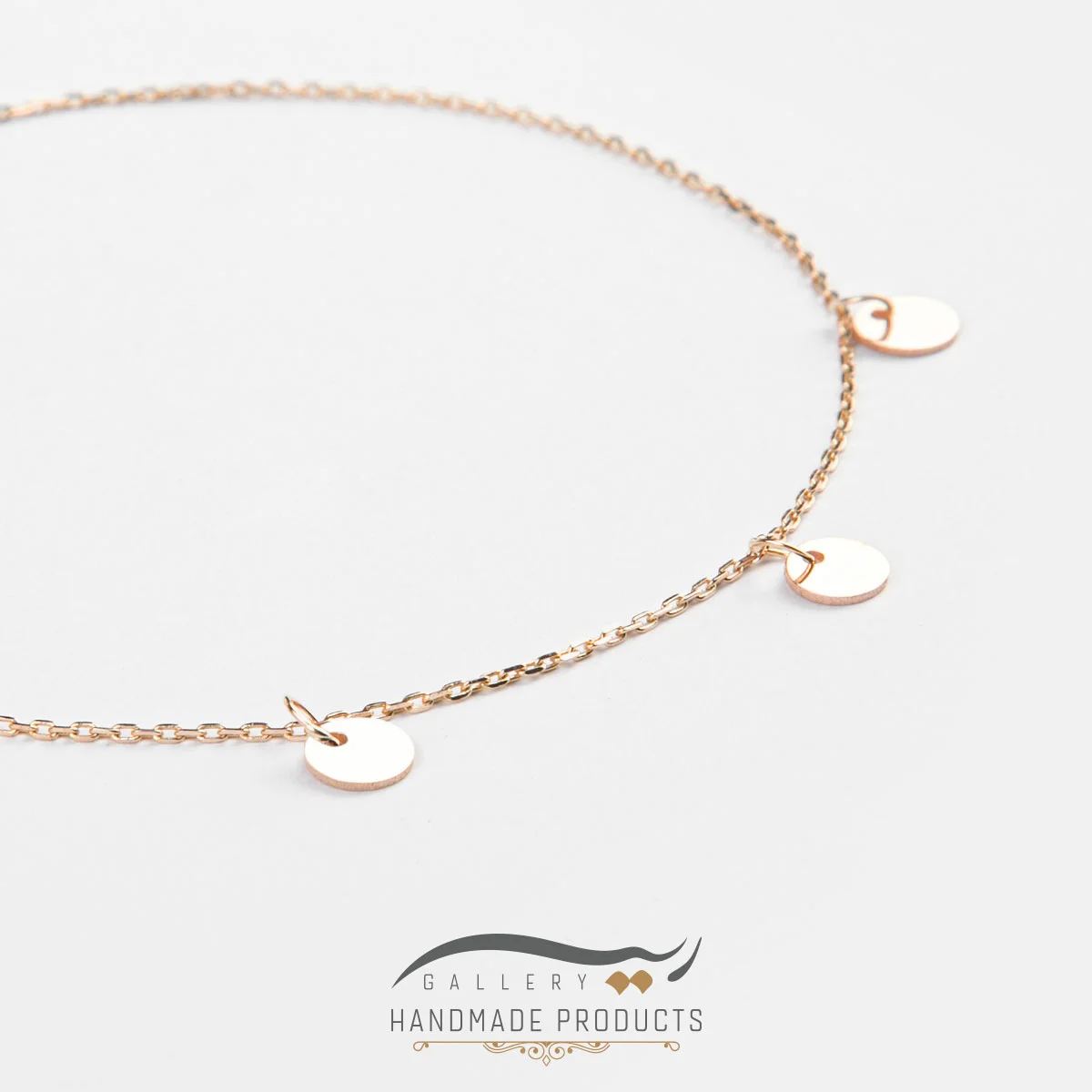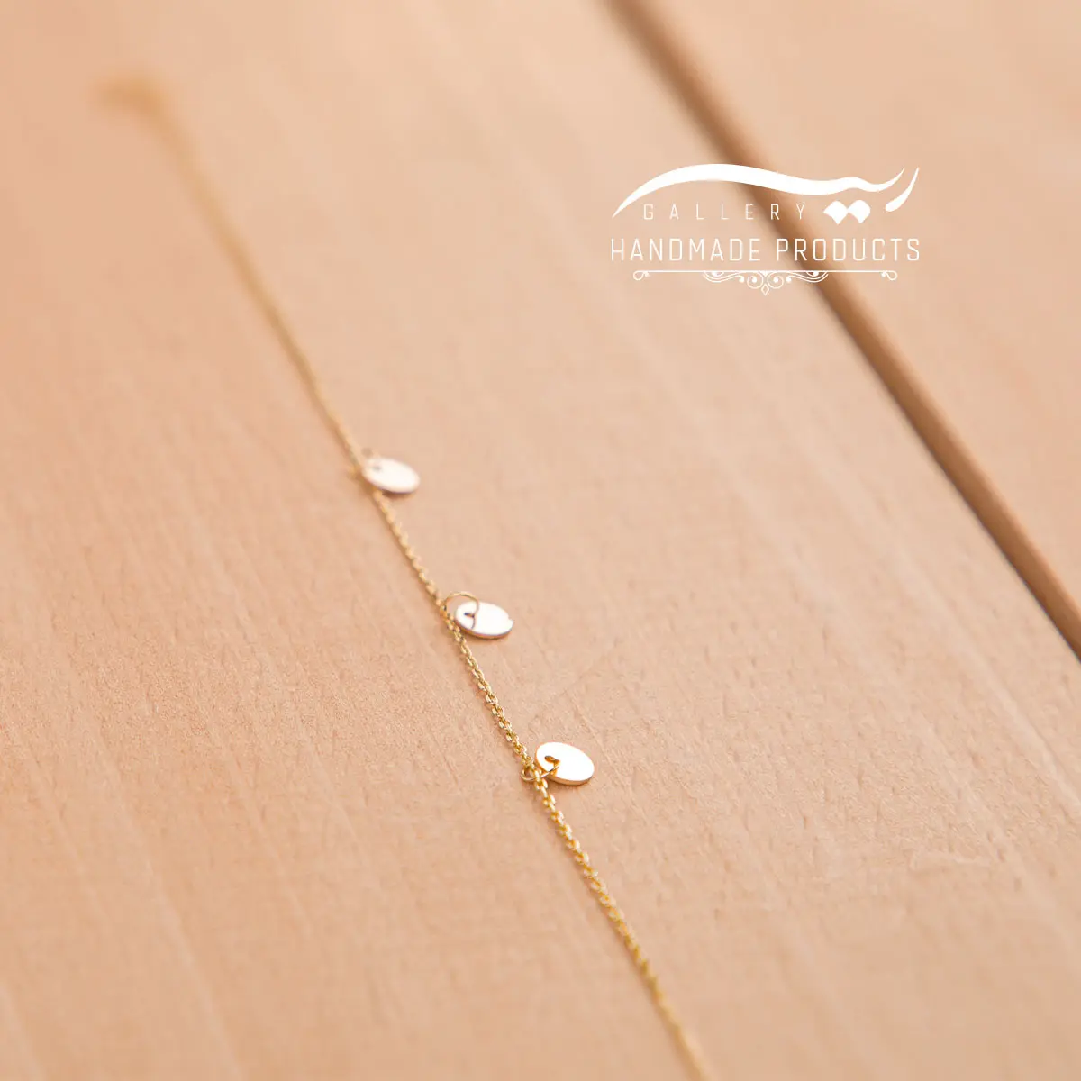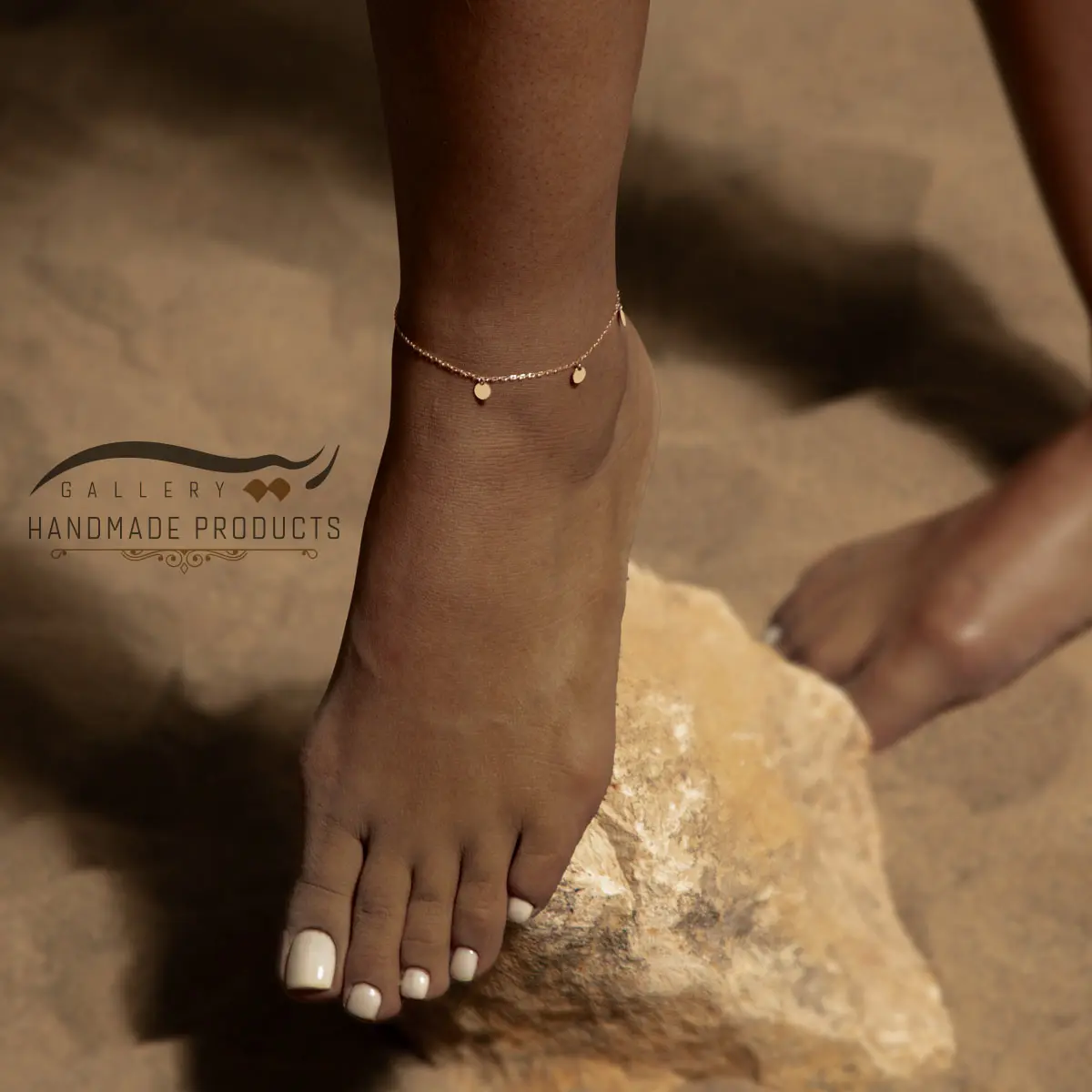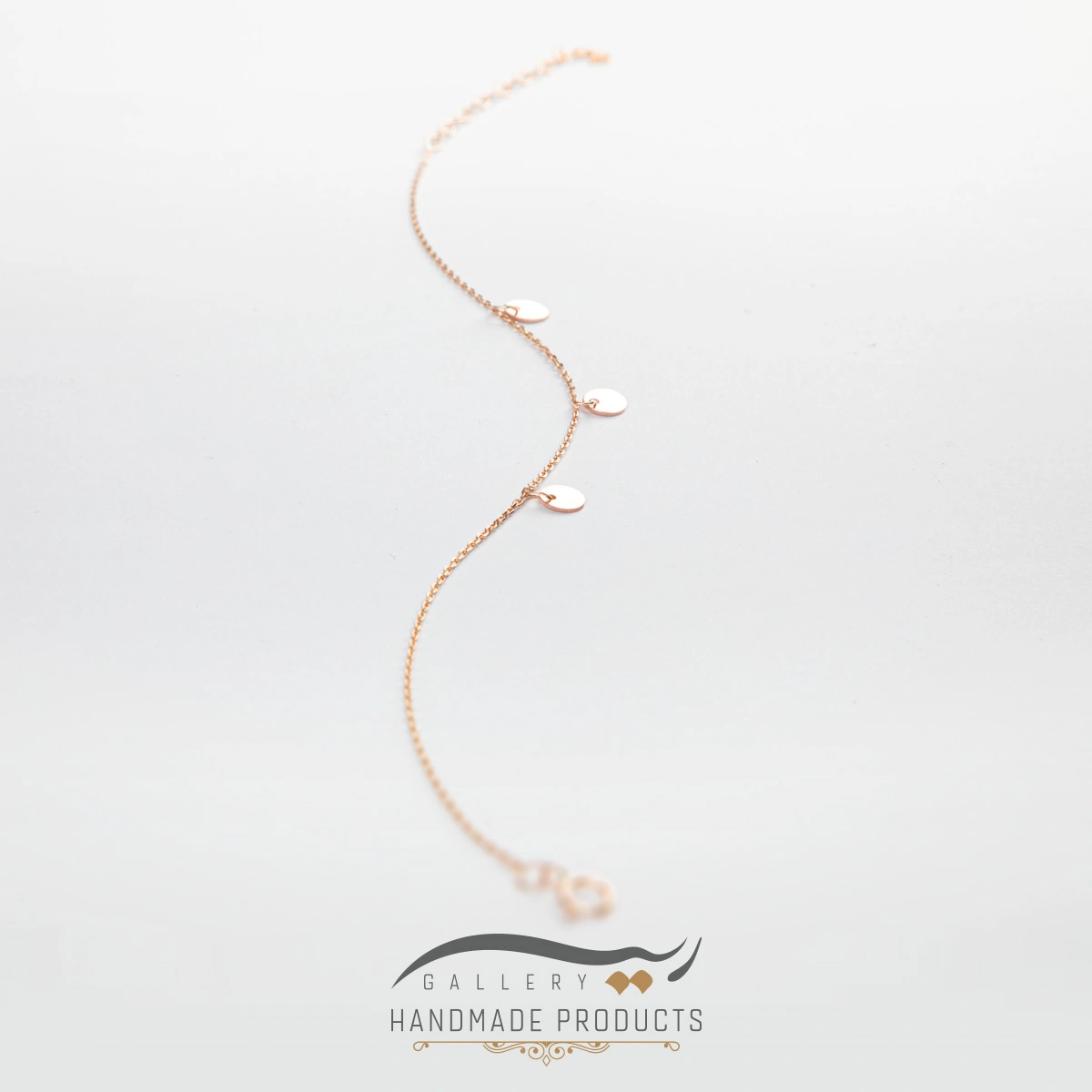 پابند طلا زنانه پولکی، پابندی مینیمال می باشد که ریسه گالری برای طراحی و تولید آن از طلا استفاده کرده است.در طراحی این پابند سه عدد پولکی دایرهای شکل به کار رفته که با فاصلهای مشخص از هم کنار یکدیگر قرار گرفتهاند. این پابند که مناسب برای خانمهاست اندازهای به طول 25 سانتی متر دارد که از این مقدار 5 سانتی متر آن مختص زنجیر سایز آن می باشد. خانمهایی که به سایر فلزات حساسیت دارند، میتوانند بدون نگرانی، در تمام طول روز این پابند را به پای خود بیاندازند.