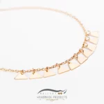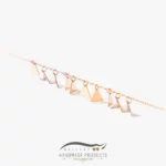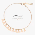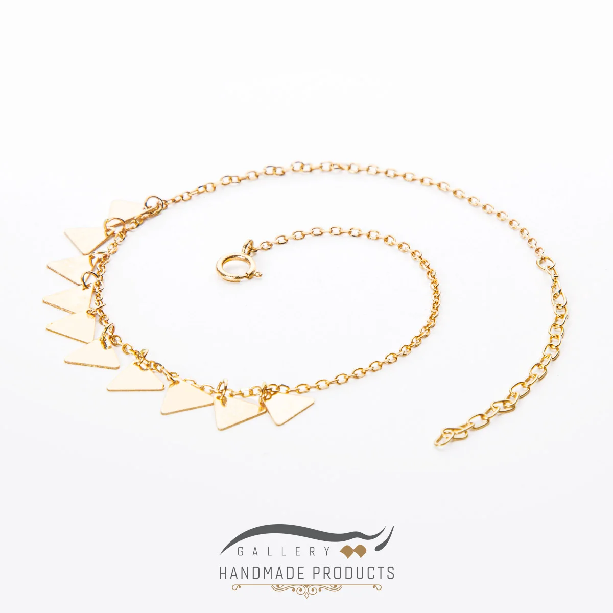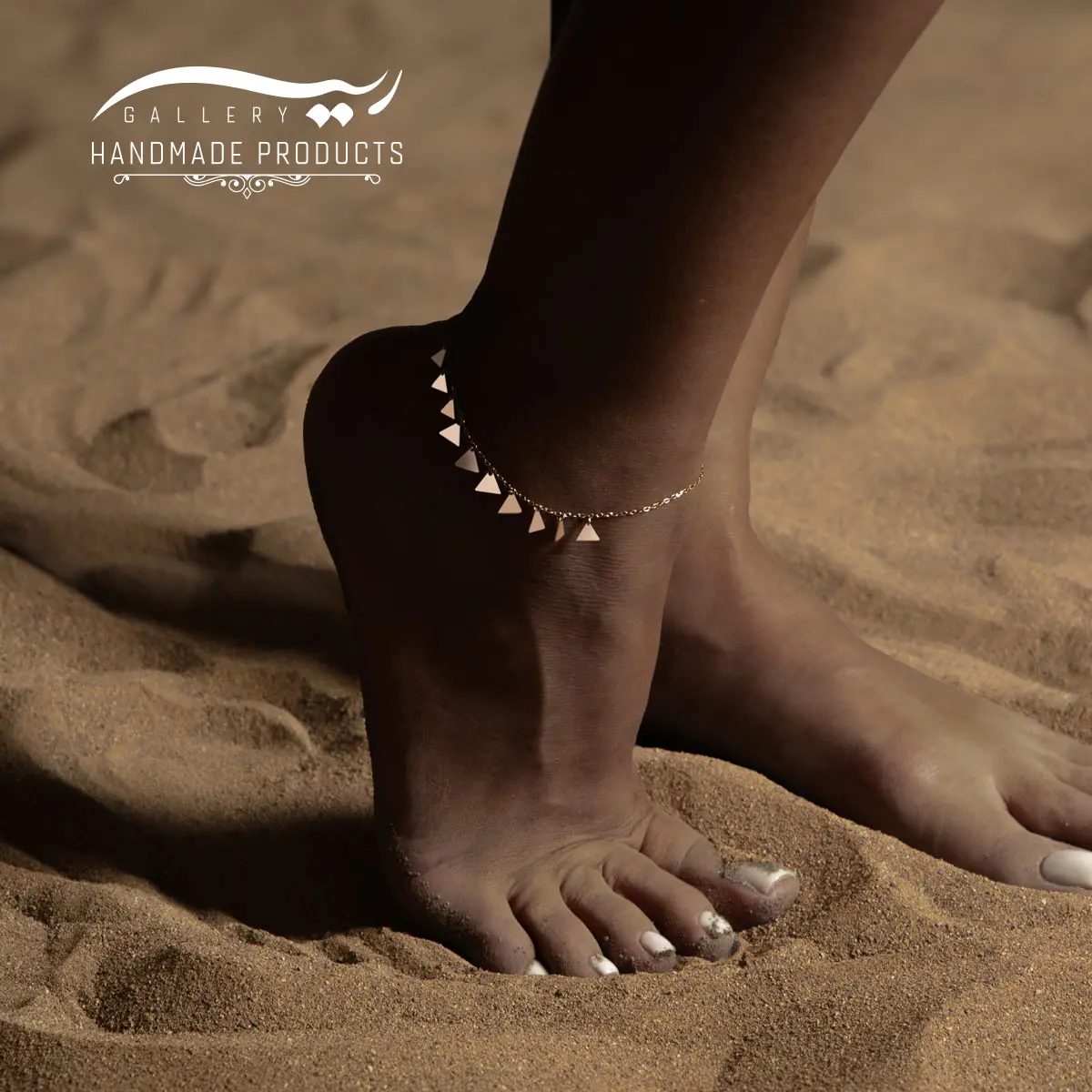 پابند طلا زنانه مثلث پابندی است که ریسه گالری برای طراحی و تولید آن از طلا استفاده کرده است. در طراحی این پابند ده عدد پولکی مثلثی شکل به کار رفته که با فاصلهای مشخص از هم کنار یکدیگر قرار گرفتهاند. این پابند که مناسب برای خانمهاست اندازهای به طول 25 سانتی متر دارد که از این مقدار 5 سانتیمتر آن مربوط به زنجیر سایز آن میباشد. خانمهایی که به سایر فلزات حساسیت دارند، میتوانند بدون نگرانی، در تمام طول روز این پابند را به پای خود بیاندازند.