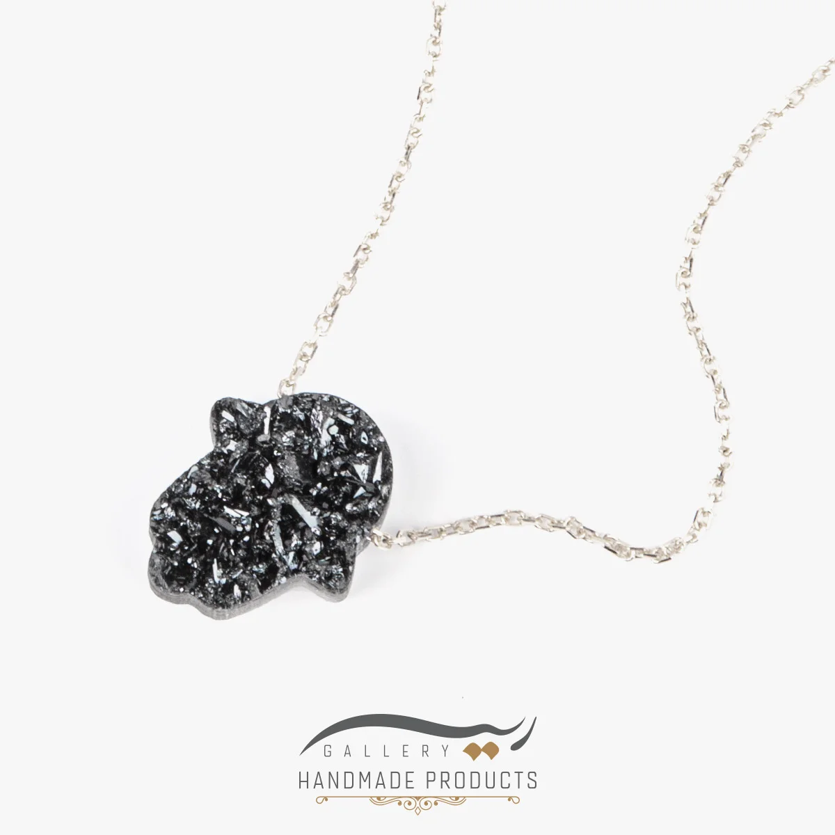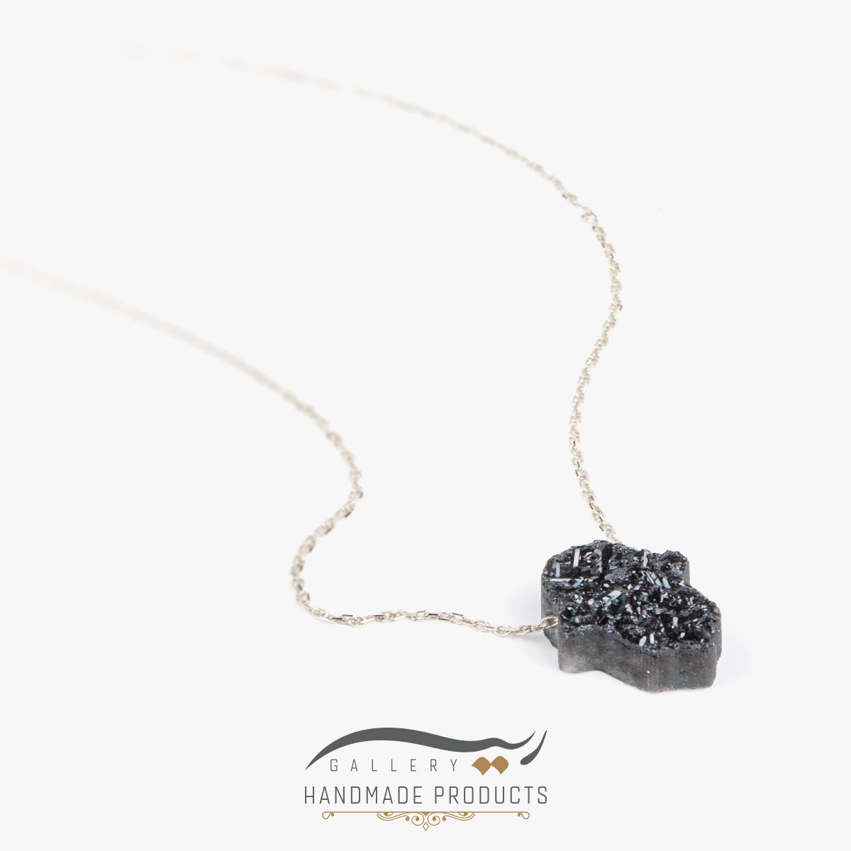 ریسه گالری، گردنبند نقره زنانه ژئود مشکی را با زنجیر نقره و سنگ ژئود برش خورده به شکل خمسه تولید کرده است. طول کلی این گردنبند زنانه با احتساب قفل به 40 سانتی متر می رسد و قفلی دارد که به سادگی می توان آن را باز یا بسته کرد. خانمهایی که به سایر فلزات حساسیت دارند، میتوانند بدون نگرانی، در تمام طول روز از این گردنبند نقره استفاده کنند.