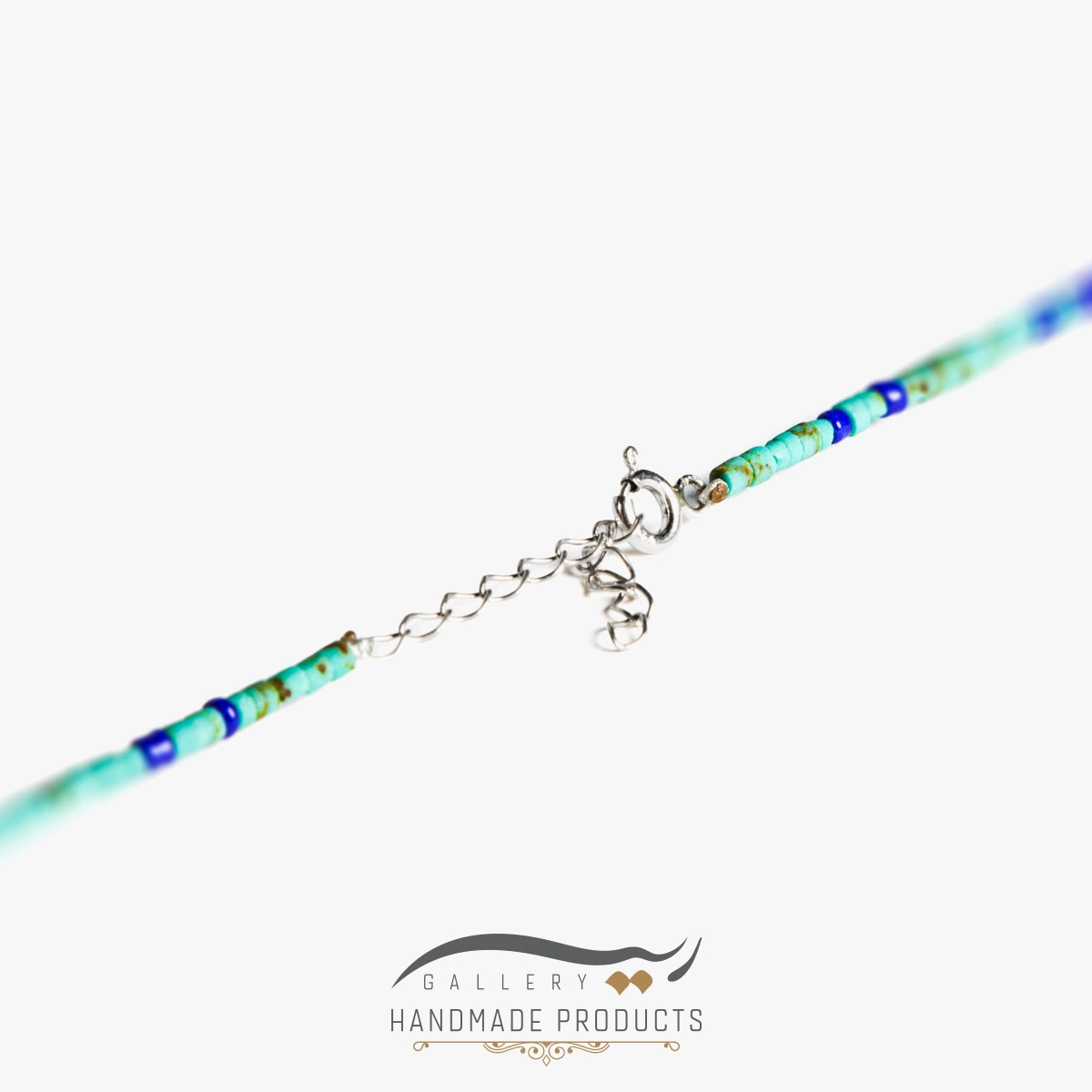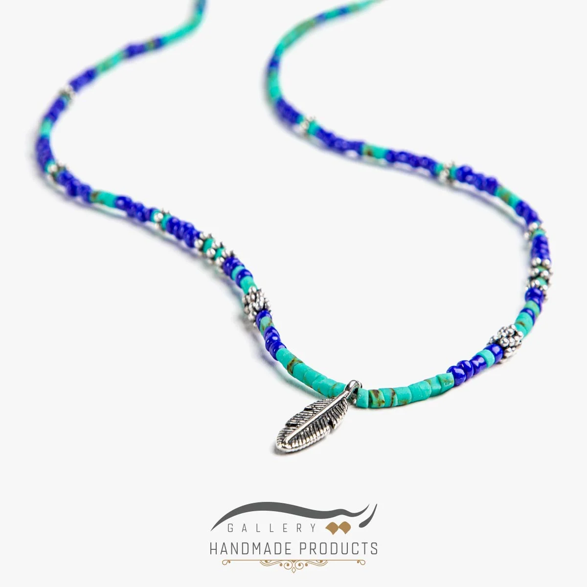 ریسه گالری برای تولید گردنبند نقره زنانه کاسکو علاوه بر نقره، از سنگ فیروزه افغان و منجوق برند چک هم استفاده کرده است. زنجیر این محصول با منجوقهای برند چک، سنگ افغان و مهرههای نقره طرح گل پوشیده میشود و در نهایت یک پلاک نقره طرح پر در وسط آن قرار میگیرد. طول این گردنبند که مناسب برای خانم هاست برابر با 45 سانتیمتر است که از این مقدار 5 سانتیمتر آن مربوط به زنجیر سایز نقرهی این گردنبند می باشد. خانمهایی که به سایر فلزات حساسیت دارند، میتوانند بدون نگرانی، در تمام طول روز از این گردنبند استفاده کنند.