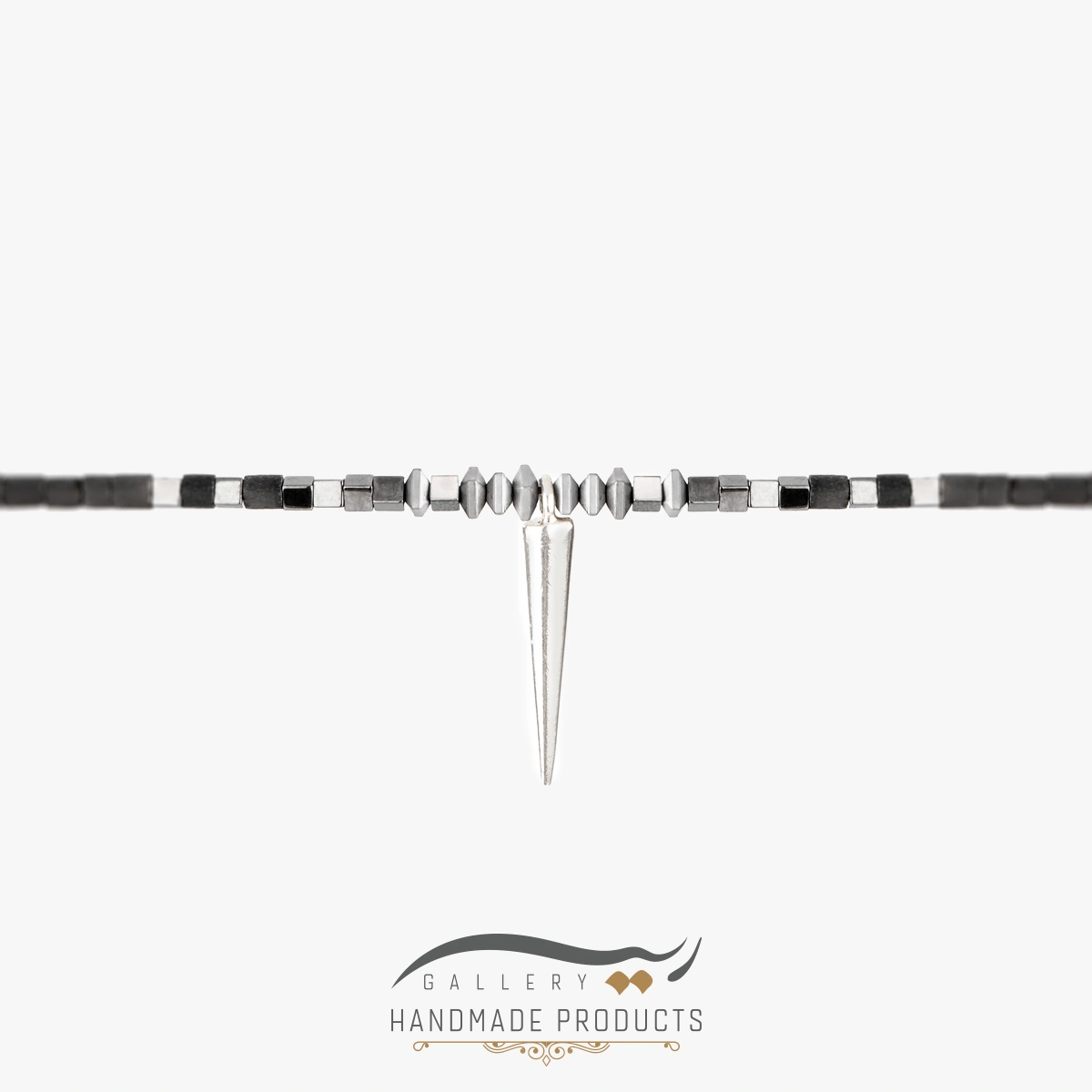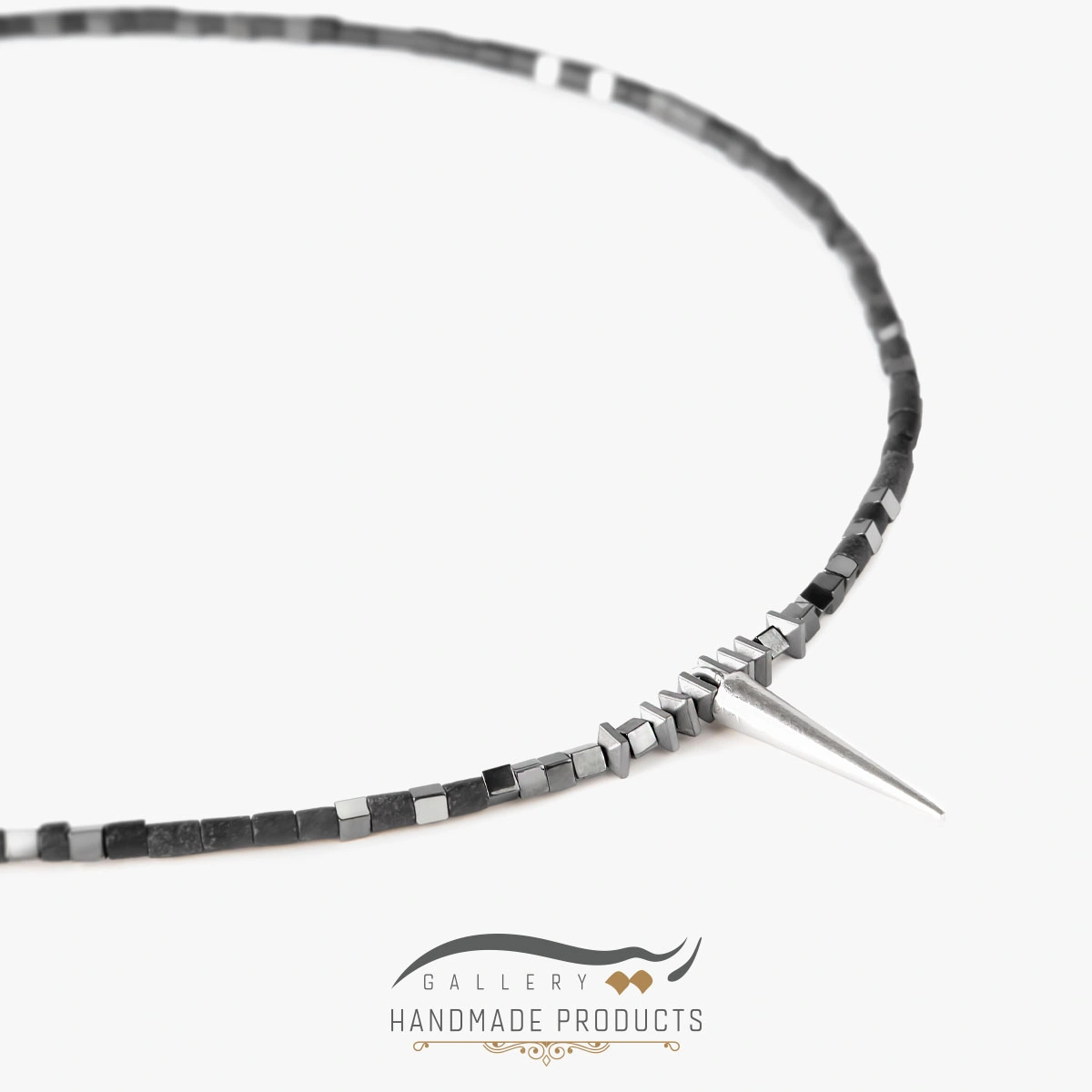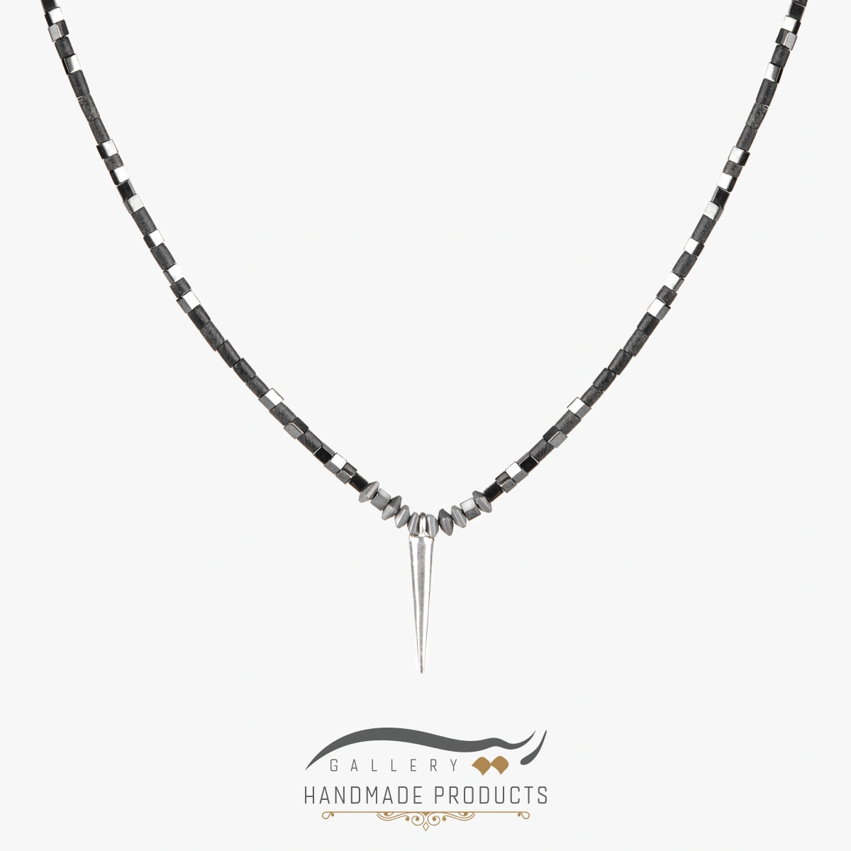 گردنبند نقره زنانه میخی بک مدل اکسسوری با طراحی بسیار مدرن است که بری تهیه و ساخت آن از زنجیری ساخته شده از سنگ های افغان و سنگ حدید به علاوه یک پلاک نقره به شکل میخ استفاده میشود. این گردنبند زنانه زنجیری به طول 45 سانتی متر دارد که از این مقدار 5 سانتیمتر آن مربوط به زنجیر سایز آن میباشد. خانمهایی که به سایر فلزات حساسیت دارند، میتوانند بدون نگرانی، در تمام طول روز از این گردنبند نقره استفاده کنند.