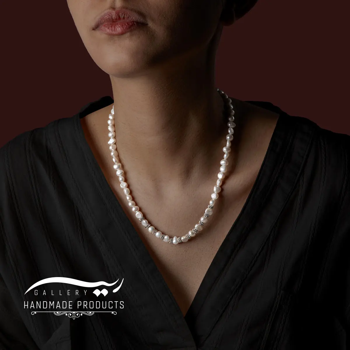 گردنبند نقره زنانه ناگا، یک محصول زیباست که با الهام از افسانههای مربوط به پریان دریایی و مروارید ساخته میشود. این گردنبند زنانه از یک زنجیر مرواریدی 40 سانتی متری استفاده می کند که در میان آن ها، مهره های نقره با طرح گل قرار میگیرند. این مدل شامل قفل و زنجیر سایز نقره هم میشود که به واسطه آن هم قابلیت تنظیم طول آن را مطابق با میل خودتان ممکن میشود و هم آن را به یک گزینه مناسب برای خام هایی می کند که به سایر متریال و مواد اولیه آلرژی دارند.