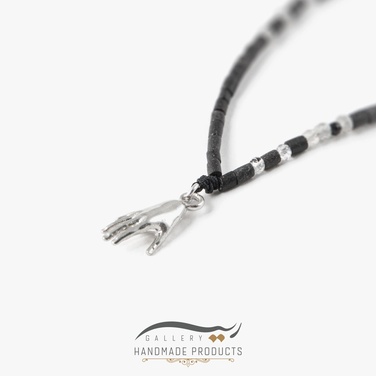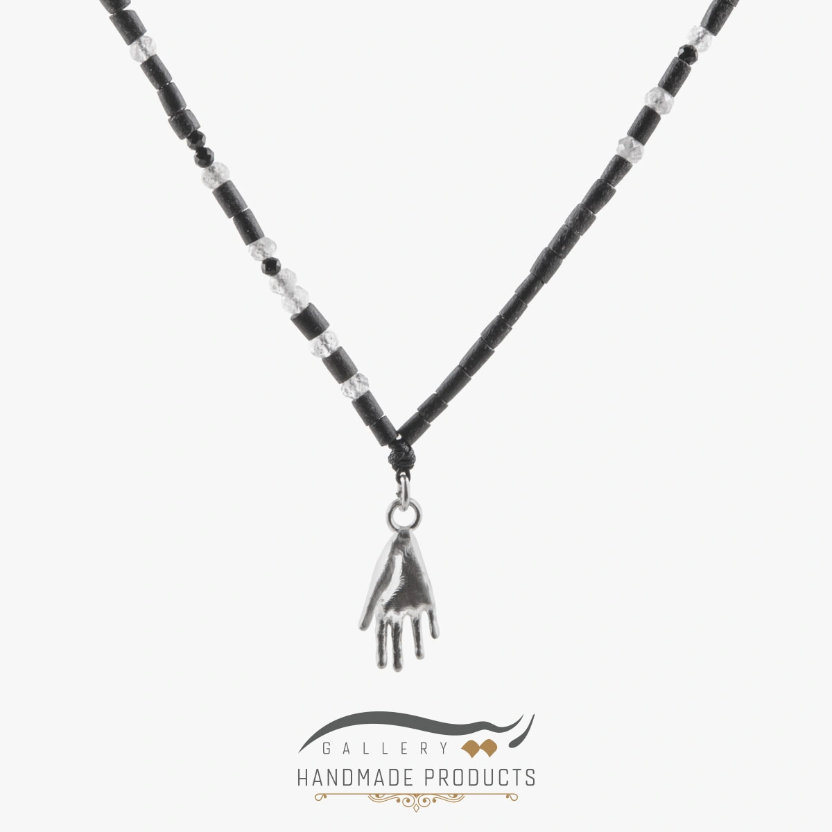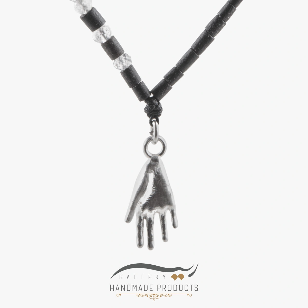گردنبند نقره زنانه ثینک از گردنبندهایی میباشد که ریسه گالری از نقره، سنگ افغان، لابرادورایت و عقیق استفاده کرده است. پترن طراحی این گردنبند زنانه به این شکل است که، یک زنجیر از سنگ افغان وجود دارد که در میان آنها سنگ های لابرادورایت بکار می رود و از آن یک پلاک نقره به شکل دست، آویزان شده شده است. این گردنبند مناسب برای خانمها طراحی می شود، به همین علت در اندازه 45 سانتیمتر تولید میشود که، از این مقدار 5 سانتیمتر آن مربوط به زنجیر سایز و قفل است. خانمهایی که به سایر فلزات حساسیت دارند، میتوانند با خیال راحت و بدون نگرانی، در تمام طول روز از این گردنبند نقره استفاده کنند.